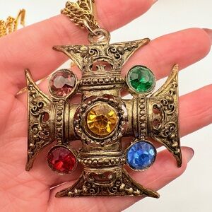 Vintage Gold Tone Multi Color Rhinestone Maltese Cross Pendant Necklace