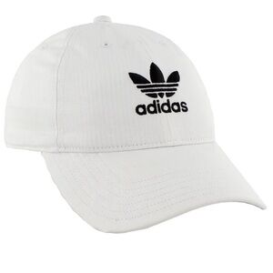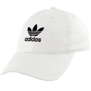 New with tags Adidas Originals youth relaxed fit white baseball cap. It features an embroidered Adidas logo, six-panel construction, pre-curved brim, and adjustable strapback closure.