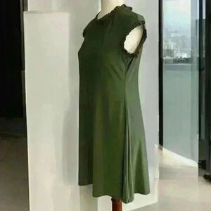 Tash + Sophie Sleeveless Knit Dress. Color Olive. Size Medium. Ruffles onto neckline and sleeves. Excellent Condition. No flaws. Closet kept in a smoke free home. Care Tags removed.