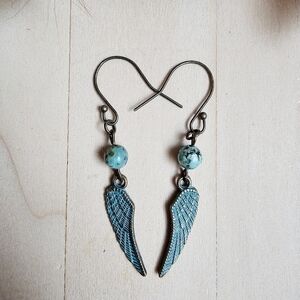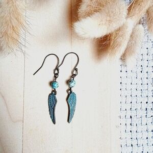 turquoise stained wing dangle earrings with genuine African turquoise in antique bronze
