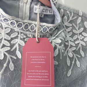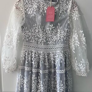 NWT Ivy City Co Midi Dress Formal Long Sleeve White Overlay Mesh/Blue Lined