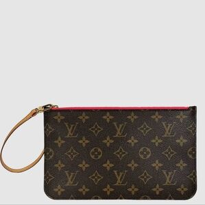 This is an authentic LOUIS VUITTON Monogram Neverfull MM GM Pochette. For those everyday essentials, this pouch is made of traditional Louis Vuitton monogram coated canvas. The pochette features gold hardware and the top zipper opens to a striped pink fabric interior with a patch pocket.