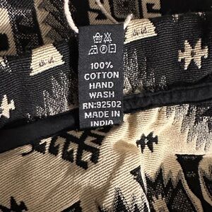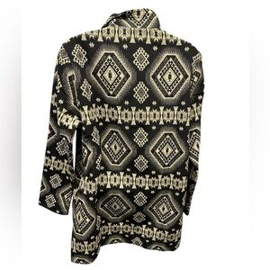 Chic blazer with intricate patterns. Black and cream hues. Elevates any ensemble. It’s labeled a L/XL. It’s a Medium to Large fit. Pit to pit measurement is 21 1/2 inches or 43 inches around. The waist is 21 1/2 or 43 inches around. The hips are 22 inches or 44 inches around. The length is 301/2 inches from the shoulders. It has nice side pockets . No buttons on this blazer.