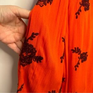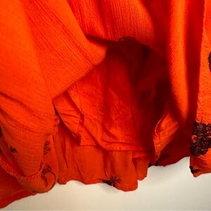 This stunning dress is orange/red with blue embroidered florals. Long ballon sleeves. Half open back. V- neck. Full lined. Hem line is slightly shorter in front, and longer in the back. 100% cotton.