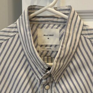 Elegant button-down with blue and white stripes. Features dual chest pockets. Ideal for casual wear.