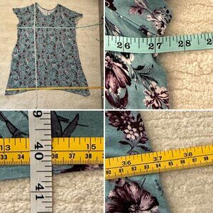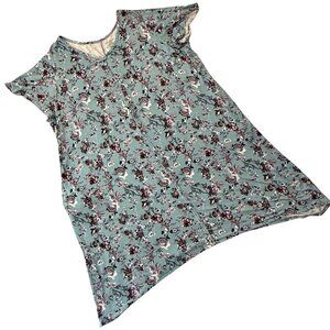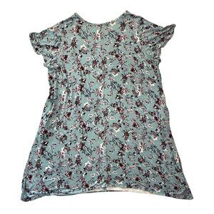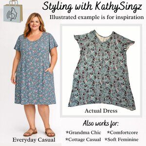 Comfortable and flattering plus-size dress by Catherines, featuring a soft teal knit base with an allover floral print in burgundy, mauve, white, and gray tones. Designed with a relaxed swing silhouette, short flutter sleeves, and functional side seam pockets. Lightweight and drapey with stretch for easy everyday wear, lounging around, and more.