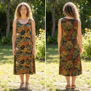Embrace the 90s earthy boho vibe with this vintage sleeveless dress by California Dreams. Made in Nepal from 100% rayon, this piece features a moody tropical jungle print with large monstera-style leaves in mustard, sage green, and rust against a black background. The fabric is lightweight, breathable, and has that signature "cool-to-the-touch" fluid drape that vintage Nepalese rayon is famous for. Perfect for festivals, summer vacations, or layering with a chunky cardigan for a grunge/whimsigoth look.