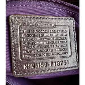 Such a beautiful bag! This is a Coach Soho East West (F18751) Shoulder Bag Tote in Metallic Bronze Leather. She's super soft and measures 16" x 10" x 3.5", with dual leather straps having a drop of 8.5". Large buckle accent on front with hidden magnetic snap underneath. Silver-tone hardware, including large buckle, grommets, handle rings and footed bottom. Lift the buckle to reveal a bright purple fabric lining (very clean). Two sections flank a large middle zippered section. Back wall has a zippered compartment and Coach creed (F18751) The front wall has two slip pockets. Matching Coach hang tag intact. This bag is in great condition, however there is some color wear on corners (hard to spot because of the color of the bag). Also, the metallic sheen has worn off on the top of the straps. The straps are still strong and sturdy. This bag is ready to carry and is just lovely!