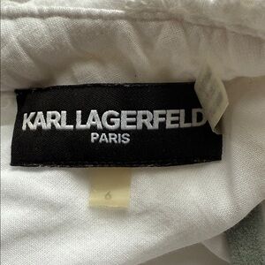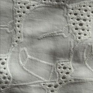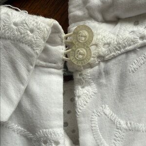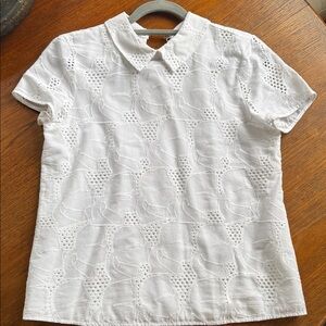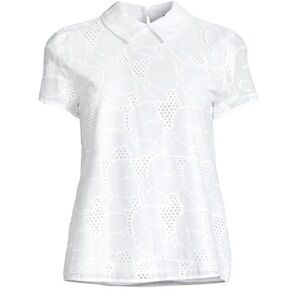 Chic white blouse with eyelet design. Features a classic collar and short sleeves. Ideal for a sophisticated look.