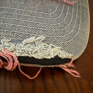 Brand new upcycled Chanel Blue denim cap with pink Chanel logo. Distressed design. Upcycled items are created by repurposing authentic materials from pre-existing pieces into something new and wearable.