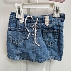 This blue denim skirt features a drawstring waist for an adjustable fit and a classic jeans look. Its versatile style makes it a perfect addition to any casual wardrobe.