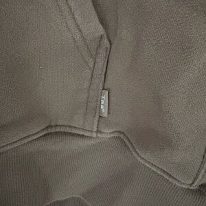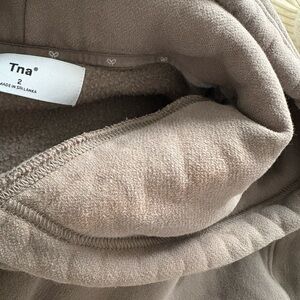 Aritzia TNA Boyfriend Hoodie in Taupe. Relaxed fit with a drawstring hood.