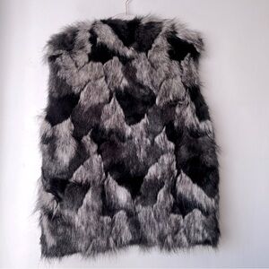 Forever 21 y2k Black & Gray Faux Fur Vest M. Black and gray faux fur sleeveless vest. hook closure around neckline. Lined. Can be worn fully open. length 25"