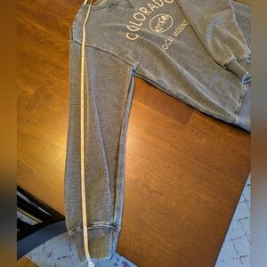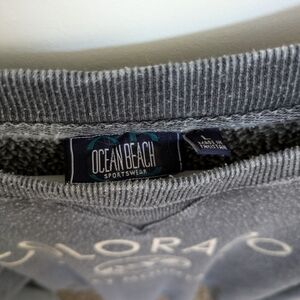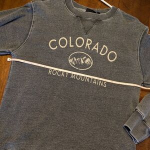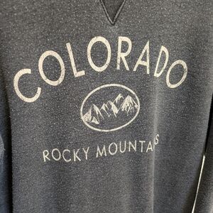 Gray crew neck sweatshirt with Colorado / Rocky Mountains graphic on front. General overall wear, no stains or holes.