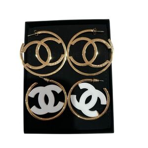Chanel earrings with iconic logo. Gold and white design. These belonged to my grandmother so I can’t say for sure if they’re real, but she did have a lot of designer clothes and accessories, plus they come with a Chanel box and bag. Open to offers.