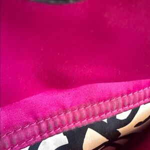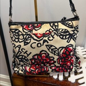 Coach tan and black design with red and raspberry accents red and black 2 hand tags size 11 by 10 in appx. Beautiful clean inside hot raspberry lining with zipper side and two compartments on opposite sides also outside large magnetic strong large pocket. Shoulder or crossbody with soft adjustable strap 1 inch wide, silver hardware. 2 hang tags size it’s stunning and fun! 2 hand tags