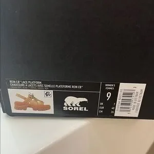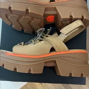 Chic Sorel sandals with tan leather and orange trim. Eye-catching design for any occasion.