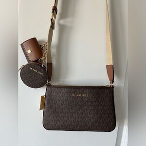 Elegant crossbody bag with signature logo design. Features adjustable strap and compact style.