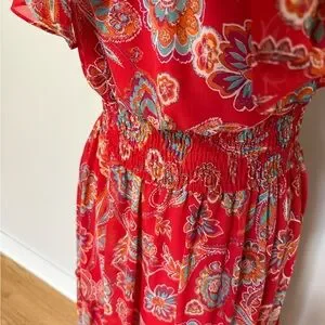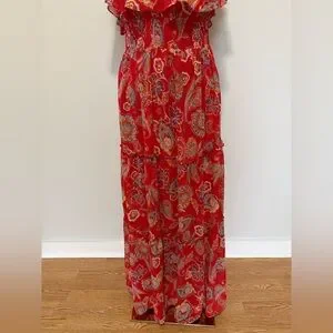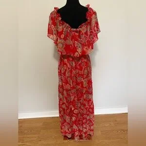Chic red maxi dress with vibrant floral patterns. Features a flowing silhouette and elegant design.