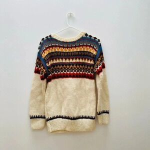 EUC. No label but feels like wool blend (not itchy), so perhaps a mixture of wool and acrylic to soften the yarn. Fairly thick and heavy sweater, handknit. Perfect for winter.