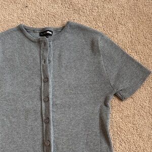 Stylish gray button-up short sleeve top. Perfect for casual wear. BRAND NEW WITHOUT TAGS NEVER WORN