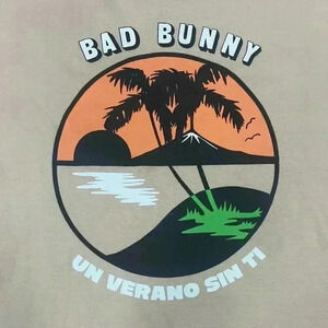 Celebrate Bad Bunny’s “Un Verano Sin Ti” album with this stylish graphic t-shirt! Features a desert tan color with a vibrant sunset, palm tree design, and bold text on the front. Lightweight and comfortable, made from 100% cotton. A perfect addition for fans of the "World's Hottest Tour"!