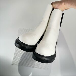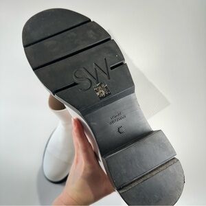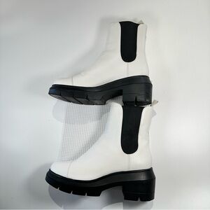 stuart weitzman chelsea boots, lug sole chelsea boots, white leather ankle boots, chunky chelsea boots women, designer ankle boots, utility boots women, modern chelsea boots, platform chelsea boots, minimalist boots women, fall ankle boots, everyday boots women, slip on ankle boots, block heel boots, womens designer shoes, statement boots, size 8 boots women, size 38.5 boots, black and white boots, contemporary footwear, fashion ankle boots, leather chelsea boots
