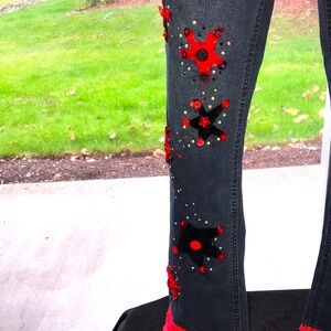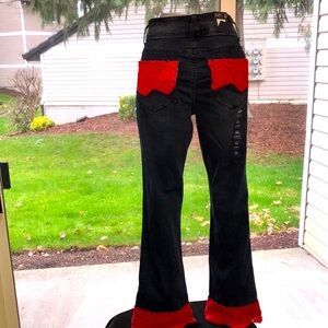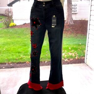 Women’s NWT ANGELS FOREVER YOUNG Sz 14 CLASSIC STRETCH CURVY BOOTCUT. Embellished Jeans with Red Accents. Stylish women's jeans featuring intricate red embellishments. Perfect for adding a pop of color to your wardrobe.