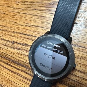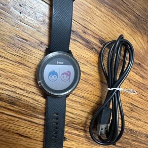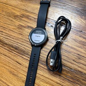 Garmin smartwatch in black. Includes charging cable. Sleek design.