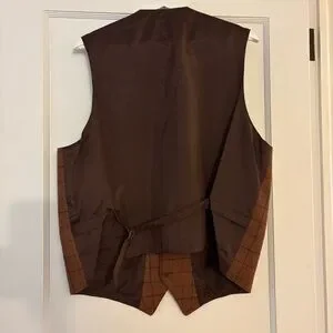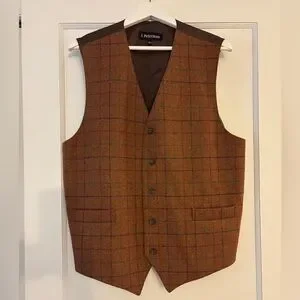 Stylish rust plaid vest. Classic button-up design. Wool and polyester.