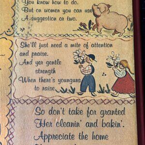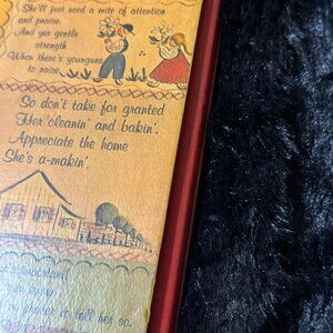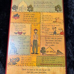 This vintage wooden wall plaque features charming rustic design and an inspiring poem about husbandly virtues.