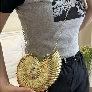 Elegant gold shell-shaped bag perfect for any occasion. Features a unique design with a chic chain strap. Add a touch of luxury to your outfit.