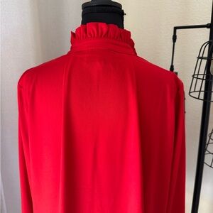 A charming update to the closet staple shirt dress we love, the Red Crepe Tate is a fiery and feminine style that can be dressed up or down, season after season. This mini seamlessly combines sophisticated details like a ruffle collar and a half placket, a perfectly pleated swing skirt, and the best part, a boxy silhouette that isn't too tight but is ultra-trendy. Easily encapsulating unfussy femininity, this elegant number is a four season stunner that will take you from the boardroom to brunch with ease and style.