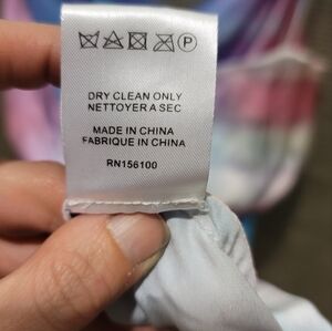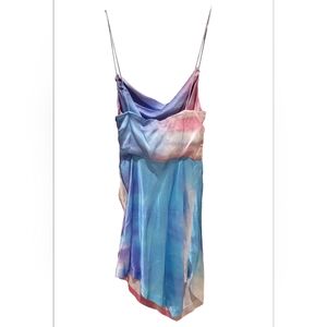 Vibrant mini dress with a unique asymmetrical hem. Features a blend of pink, blue, and white hues. Perfect for a night out.
