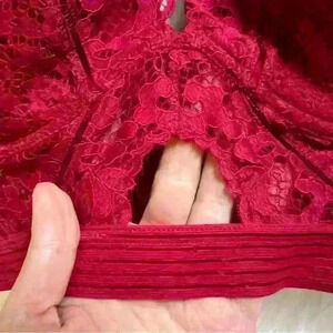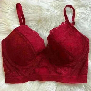 Red lace. Back hook and eye closure. Lined and lightly padded. Underwire and boning. No flaws.