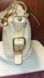 Sides have buckle and strap decor in gold metallic that continues to bottom to act as feet