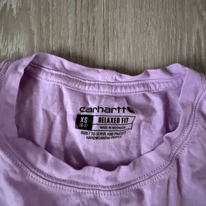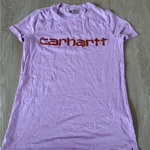 Stylish lavender tee with bold red Carhartt logo. Soft and comfortable for everyday wear.