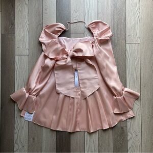 This elegant pink dress features a stunning bow-back design, perfect for any special occasion. The soft pink hue adds a touch of femininity and grace.