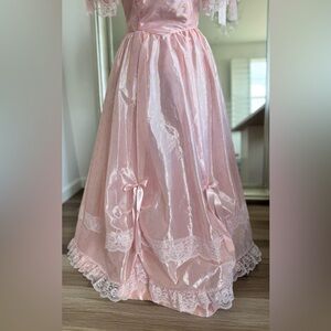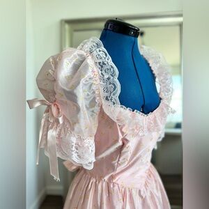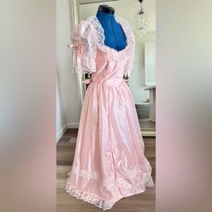 vintage 80s prom dress pink lace puffy bows tulle ball gown puff sleeves ILGWU