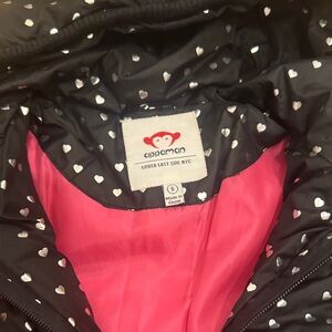 Chic black jacket with white heart accents. Features a vibrant pink lining.