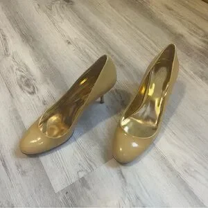 Yellow simple high heels with gold lining, round toe and 3" heel. Worn a few times, but the outer leather is in great condition! A couple of tiny marks that can probably be wiped clean but no scuffs. Size US 9, they run a little small more like an 8.5.