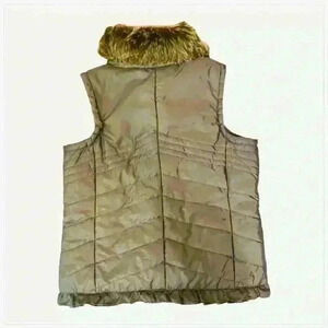 Keywords: women's vest, quilted vest, bronze vest, faux fur collar, sleeveless vest, winter fashion, casual wear, zip front vest, ruffled hem, pre-owned vest, medium size vest, women's outerwear, stylish vest, winter wardrobe, versatile vest.