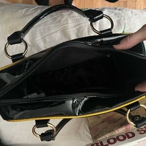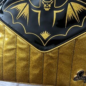 Stylish shoulder bag with a bat design. Features glossy black and shimmering gold colors. Perfect for adding a unique touch to any outfit.