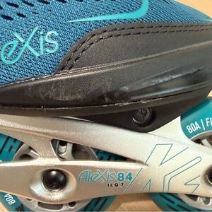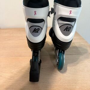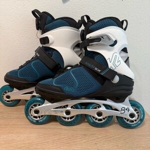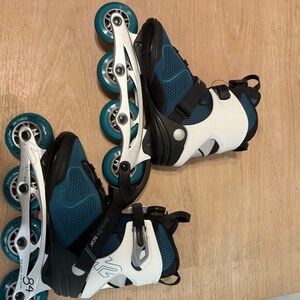 Sleek teal and white inline skates with secure straps. Ideal for smooth rides.