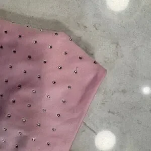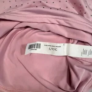 Pre-owned in good condition with light general wear. A faint mark is visible near the hem area (shown clearly in photos). Rhinestones appear intact overall. Please review photos for additional details about the condition of the garment.