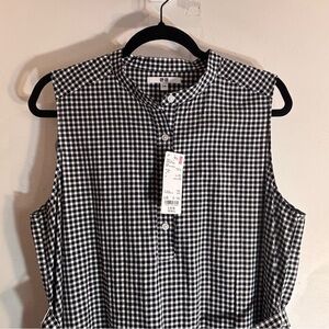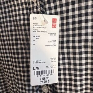 UNIQLO Sz L Black and White Gingham Sleeveless Dress Tiered Ruffles Belted Slub Cotton Seam pocket. NEW WITH TAG Stylish checkered midi dress with a sleeveless design. Perfect for versatile wear.