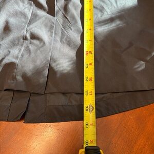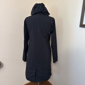 Black jacket with hood and zippered pockets, zips up the front. Cinchable hood. Lined. Back is slightly longer than the front. Back vent. It has a marking that says "h2no" so likely good in the rain. The sleeve cuffs show a little wear and there is a small white dot on one sleeve - could be sharpied over - otherwise in good condition - see last photo.