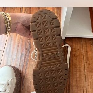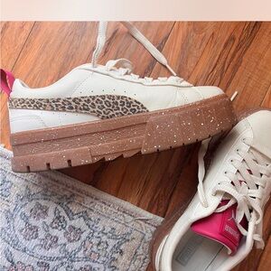 Chic Puma sneakers featuring a cream base and leopard print. Brown sole with striking pink detail.
