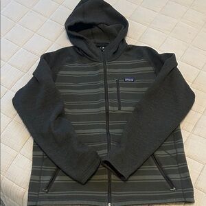 Cozy Patagonia fleece with dark stripes. Features a hood and full zip.
