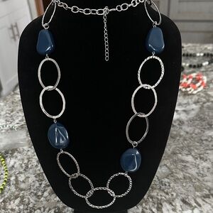 This elegant necklace features a stunning combination of silver and blue elements, perfect for adding a touch of sophistication to any outfit. 42” long